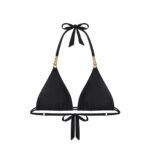 Deze zwarte Pain de Sucre QUINN 61 bikini top biedt een verfijnde look voor zonnige dagen. Het model kenmerkt zich door elegante triangel cups die zijn voorzien van decoratieve goudkleurige schakels aan de bandjes. Tussen de borsten verbindt een dubbel bandje de cups voor een speels effect. Met de striksluitingen in de nek en op de rug pas je deze bikini top eenvoudig aan voor een comfortabele pasvorm.