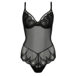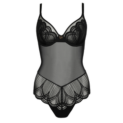 De Cathia beugel body van Marie Jo is uitgevoerd in de kleur zwart. Deze sexy body in transparante materialen met een plunge neckline, geeft een mooi en laag uitgesneden decolleté. De cups liften en centreren de borsten voor een mooi decolleté. Door het lichtdoorschijnende materiaal is de huid zichtbaar. Tussen de cups is de body versierd met een gouden detail. De achterkant van de body is heel verfijnd afgewerkt op de billen en heeft een open detail. Zwart is de perfecte kleur voor deze sexy en minimalistische body. Je kunt er eindeloos mee combineren.Verzenden