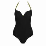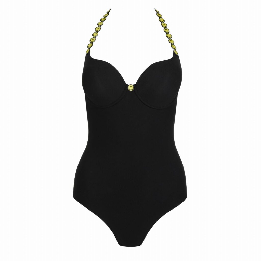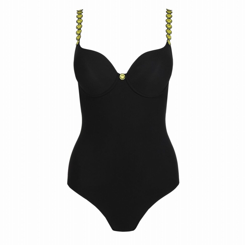 Pure klasse, altijd on trend. De bestseller Tom bh van Marie jou is er nu in deze super leuke Smiley serie! De rondjes op de schouderbandjes en tussen de cups zijn nu vervangen voor smiley’s op een zwarte ondergrond. De perfecte pasvorm die je van de voorgevormde Tom bh gewend bent alleen nu in body variant. Leuk detail, body kan ook als halter gedragen worden. De cup omvat bovenaan een groot deel van de borst en de beugel zorgt voor optimale ondersteuning. De hoge decolletébelijning boven de borst loopt diep omlaag tussen de borsten. Combineer deze body met een leuke doorschijnende top waarbij de smiley’s gezien mogen worden en jouw dag kan niet meer stuk! |
