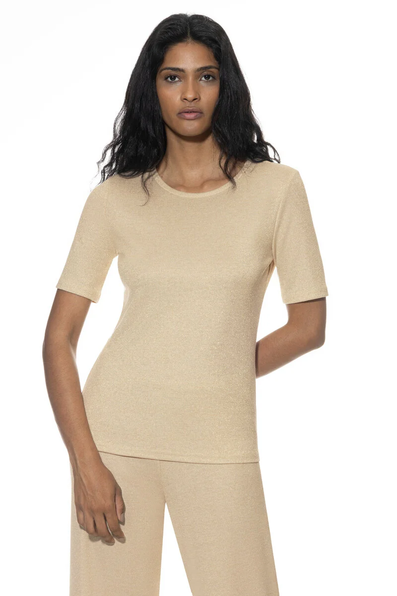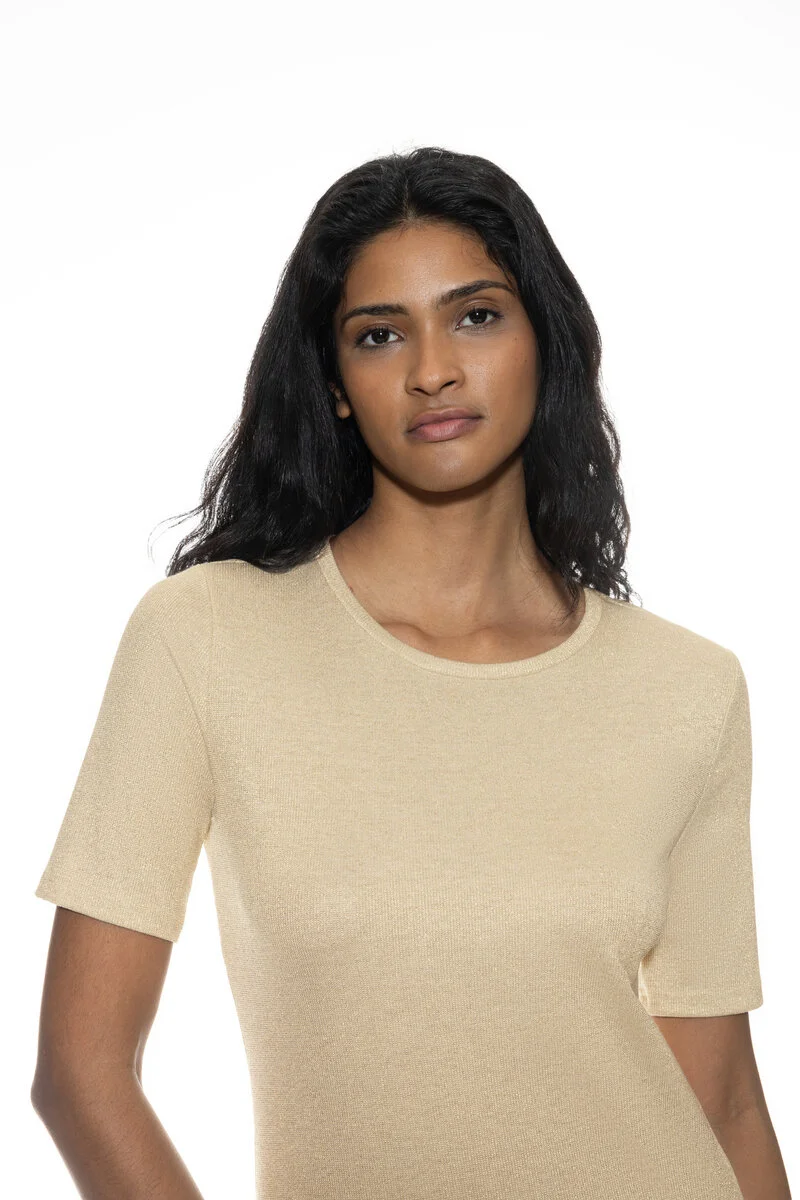 Details: Deze top in de kleur Golden Shine uit de serie Sparkling Rib is een fantastische must-have. Een mooie dunne rib kwaliteit met een lurex glittertje. Door 60% viscose is deze top heel zacht, vochtregulerend en is makkelijk te wassen. Shirt heeft een smalle pasvorm, ronde hals, korte mouwen en een hoog draagcomfort. Combineer met de bijpassende broek en je hebt een super set voor naar het strand of die leuke lunchtent. Ook leuk met een blazer of witte blouse te combineren!