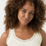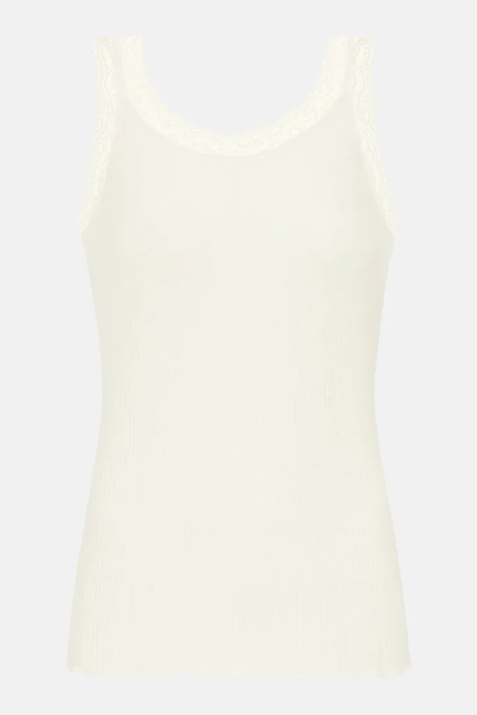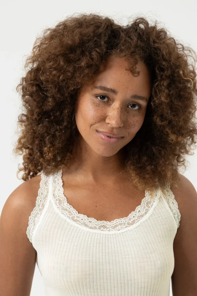 Details: Brede bandjes, ronde hals, geribde structuur, decoratief kant, zeer elastisch