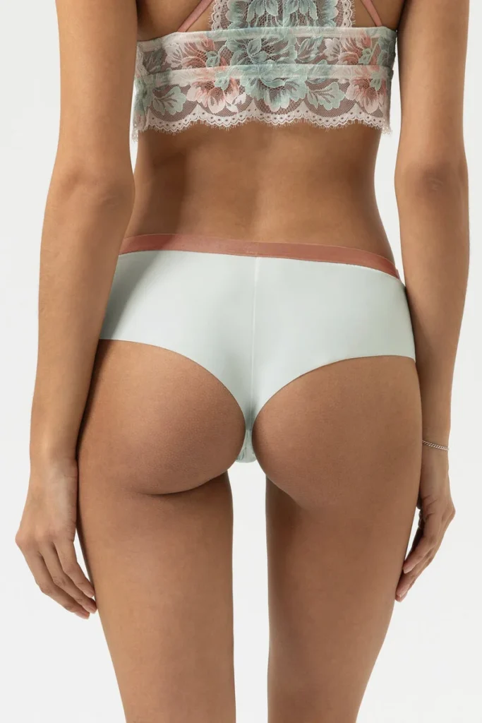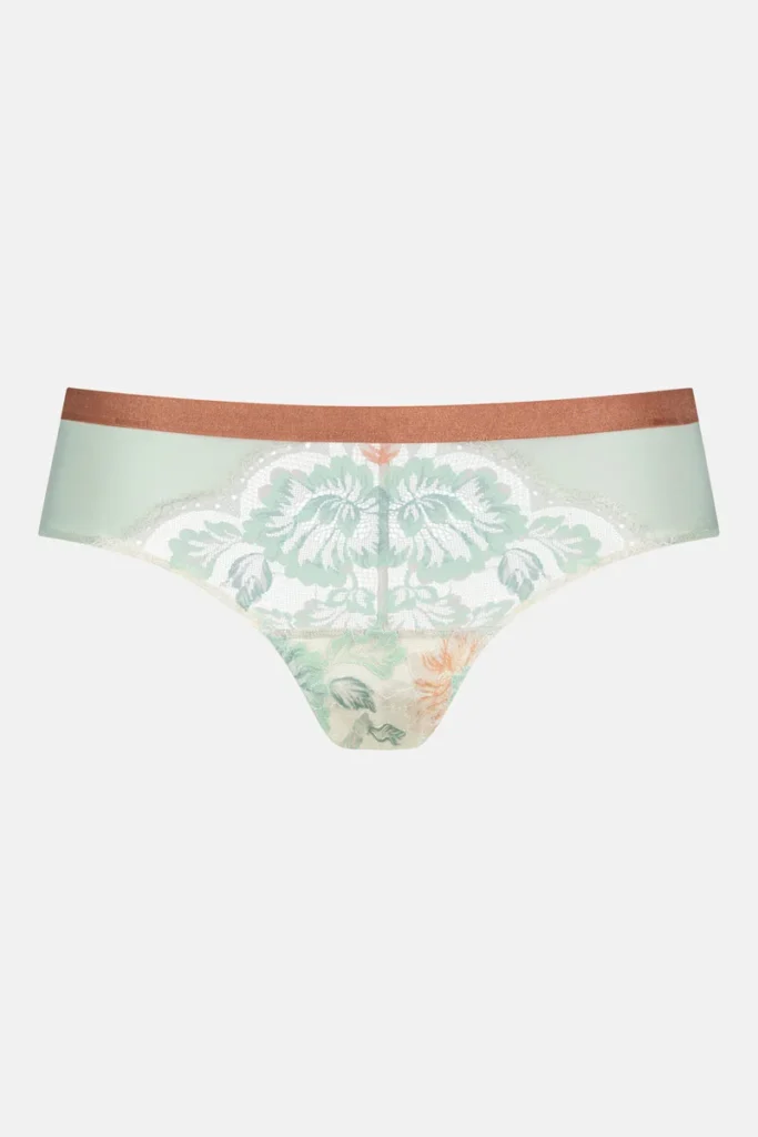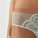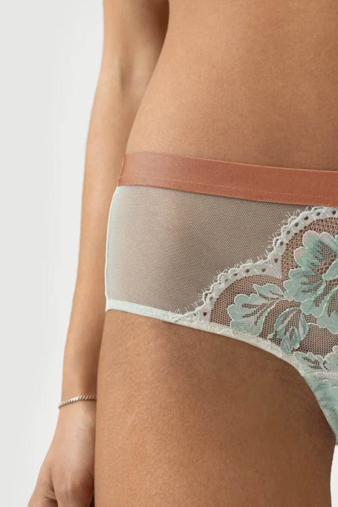 Vrouwelijk en stoer deze Cheeky hipster in Oatmilk uit de serie Poetry Vogue. Voorkant van mesh met bloemenkant, achterkant is naadloos en elastische tailleband met glans. Katoenen inzetstuk aan de binnenkant van het kruis. Super comfortabel zacht rekbaar slipje. Combineer met de bijpassende bralette en je hebt een geweldige set!