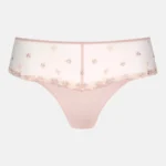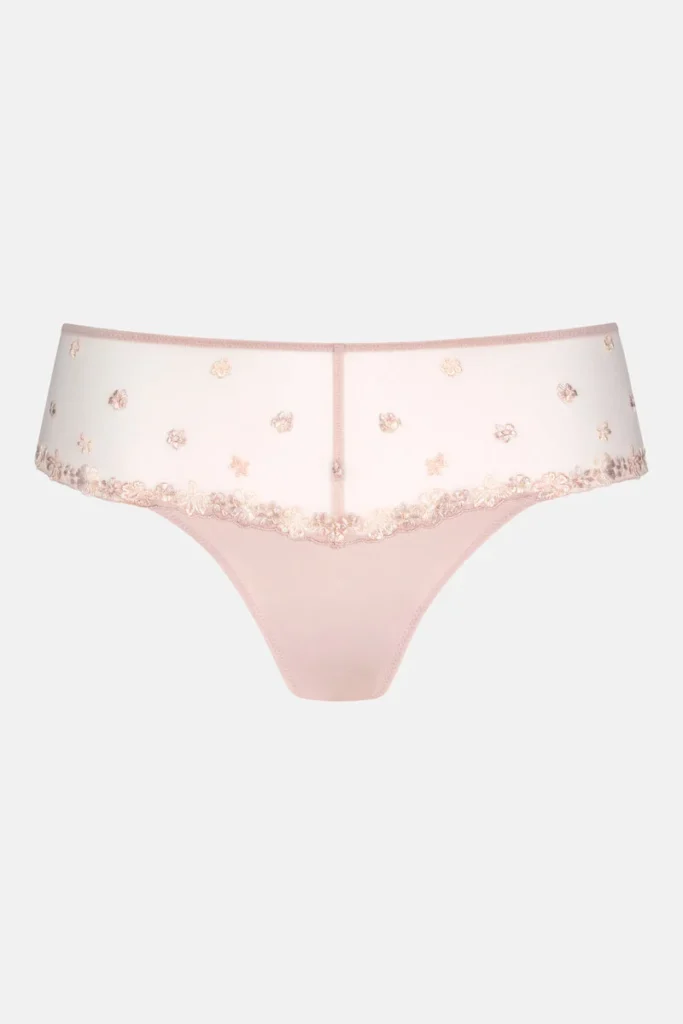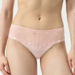Deze Mey PRETTY JOAN hipster in de kleur huid combineert een verfijnde uitstraling met dagelijks draaggemak. De voorzijde van de slip is uitgevoerd in een transparant mesh materiaal, verrijkt met een gedetailleerd bloemenmotief en een golvende afwerking aan de onderzijde. De achterzijde bestaat uit een gladde, ondoorzichtige stof die vlak op de huid ligt. Door de platte afwerking bij de beenopeningen tekent deze hipster niet af onder kleding. Het model valt laag op de heupen en biedt een comfortabele pasvorm. Dit item is een elegante toevoeging aan je garderobe en voelt licht aan op warme dagen.