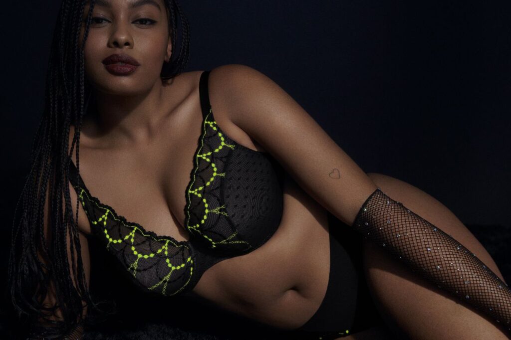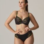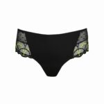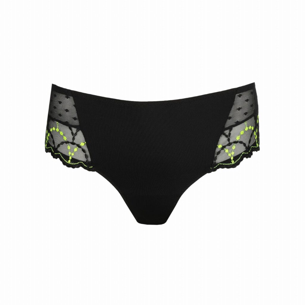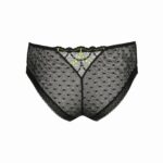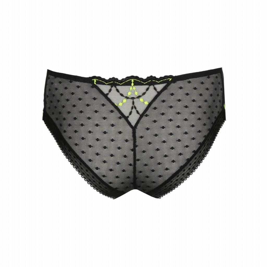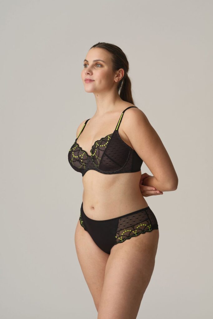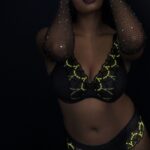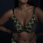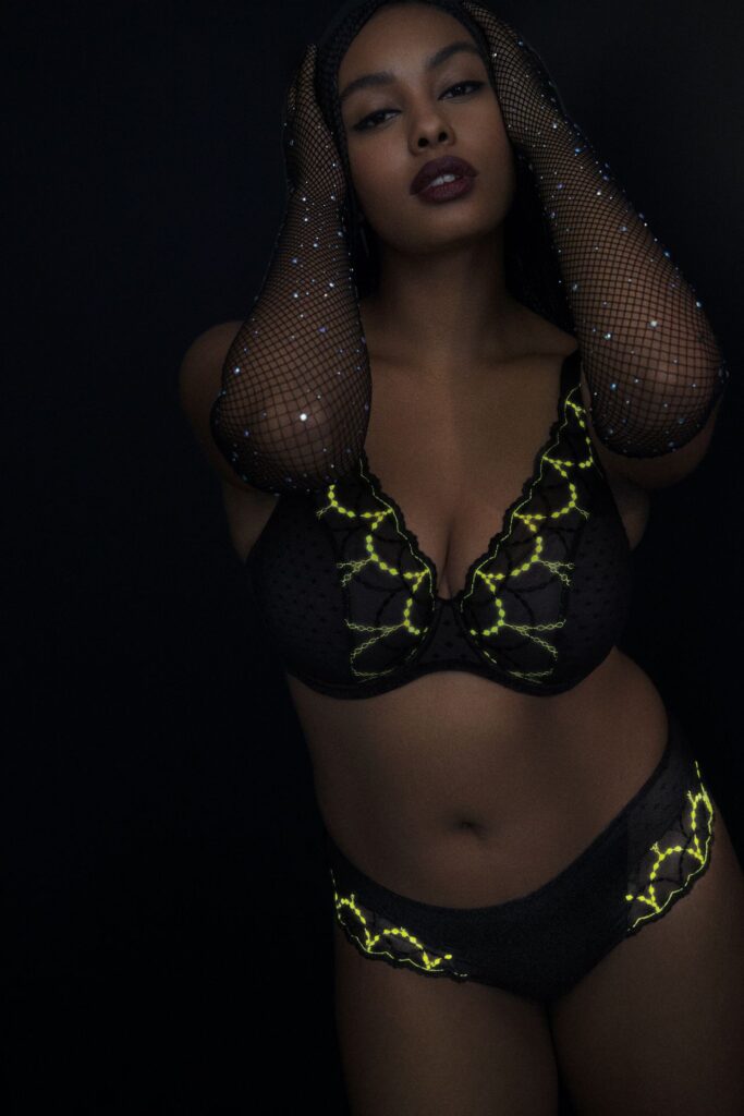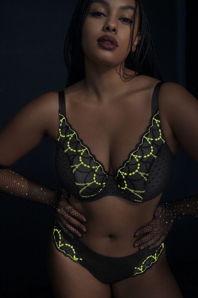 | Dark Glow is zwarte broderie met gele neonaccenten en een funky glow-in-the-dark effect. Een speelse nineties touch die subtiel oplicht in het donker maar volledig onzichtbaar is onder je kledij. |
