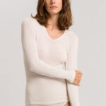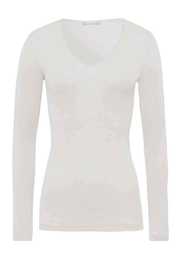 Details: t-shirt van de serie Hanro WOOLEN SILK Ultra Light, lange mouwen, geen zijnaden, v-hals, isolerend tegen warmte én kou.