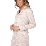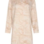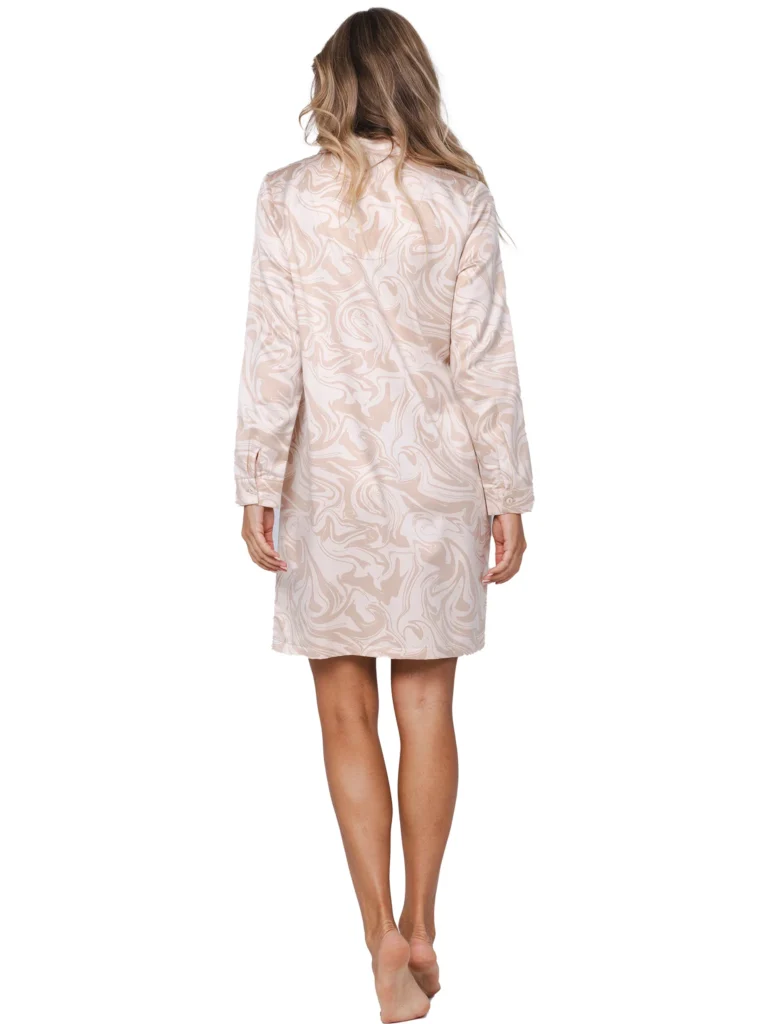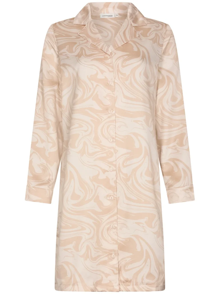 Dit elegante nachthemd komt uit de Eternal serie van Pastunette Premium. Het nachthemd is beige van kleur met een crème marmer print. Heerlijk met lange mouwen, een kraagje en een doorknoop sluiting. Het nachthemd is gemaakt van 83% polyester en 17% katoen in een cuddle satin kwaliteit. Cuddle Satin is een luxueuze en super zachte stof met een fluweelzachte buitenkant en een knusse, warme binnenkant. Het materiaal voelt licht en soepel aan op de huid, heeft een subtiele glans en blijft mooi in model zonder te kreuken. Een perfecte combinatie van comfort en elegantie. De lengte van het nachthemd is 95 cm in maat 38.