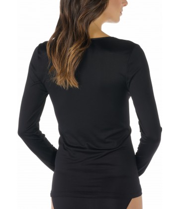Geniet van een fantastisch huidklimaat door een innovatieve weefconstructie e de unieke materiaalcombinatie, viscose aan de binnenkant en microvezels aan de buitenkant. Dit zorgt voor een soepele pasvorm en een chique glans. Door 50% viscose is het shirt met lange mouwen heel vochtregulerend, heeft een aangenaam draaggevoel en is makkelijk te wassen.