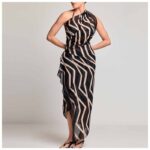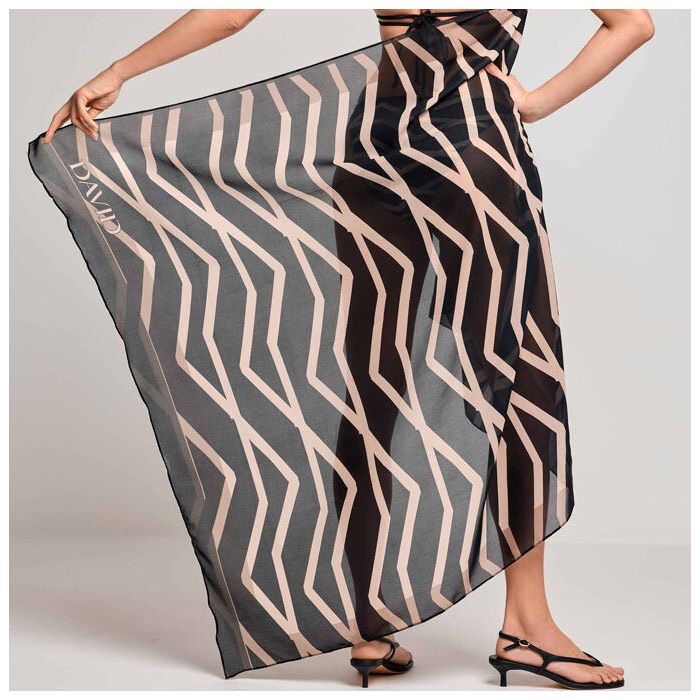 Deze zwarte pareo van Davidbeach is gemaakt van lichte, soepel vallende polyester met een opvallend grafisch zigzagdessin in goudkleurige tinten. De semi-transparante stof heeft een gladde structuur en biedt veelzijdige draagmogelijkheden. Je kunt de pareo op verschillende manieren omdoen, van wikkel rond je heupen tot omslagdoek over je schouders. Het dessin loopt over de volledige lengte en geeft een vrouwelijk effect. De afwerking met dubbele stiksel zorgt voor stevigheid. Deze strandaccessoire is onderdeel van de IRMA collectie van Davidbeach en combineert stijlvol met verschillende bikinistijlen en badpakken.
