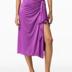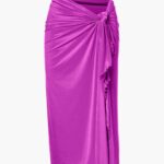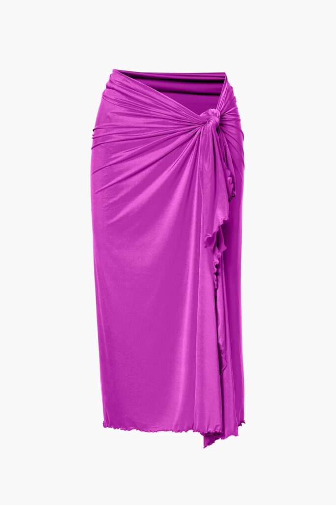 Deze paarse strandrok van Goldbergh valt soepel over de heupen en heeft een wikkelmodel dat je aan één zijde vastknoop met een gedraaide knoop. De gladde, licht glanzende stof heeft een rekbare structuur en golf afwerkingen langs de zoom en het rechterzijpand. De pareo valt midi-lang en heeft een asymmetrische onderkant door de openstaande split aan de zijkant.