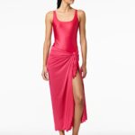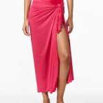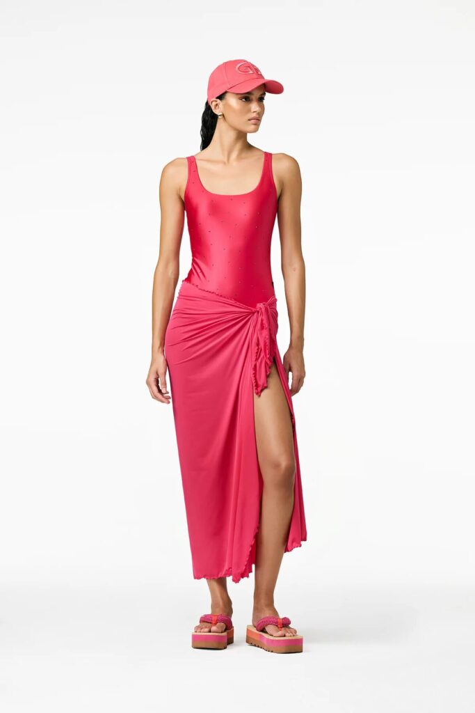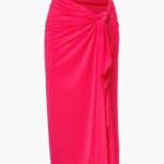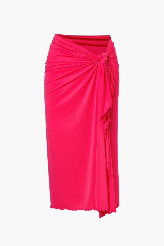 Deze strandpareo van Goldbergh is uitgevoerd in een opvallende pink tint en heeft een soepel vallende, licht glanzende stof. De BLUORA pareo wordt aan de zijkant vastgebonden met een knoopdetail, waardoor geplooide vouwen ontstaan die een vrouwelijk silhouet creëren. De afwerking langs de randen is uitgevoerd als een fijne, licht golvende rand. De rok valt midi-lang en heeft een split aan de voorzijde.