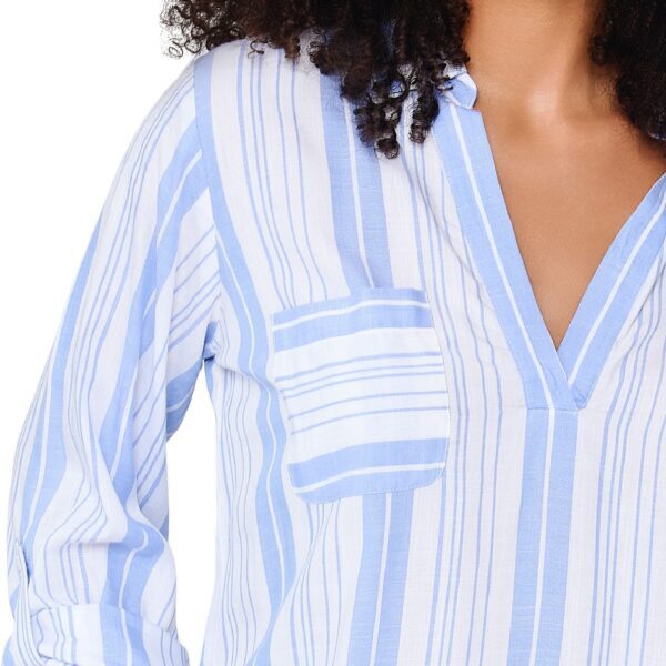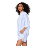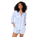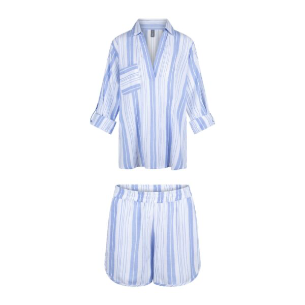 Deze pyjama set van LingaDore bestaat uit een blouse met driekwart mouwen en een bijpassende short. De bleu gestreepte stof in katoen is ademend en huidvriendelijk. De blouse heeft een v-hals met kraagje en een borstzakje aan de voorkant. De oprolbare mouwen zijn praktisch en geven de blouse een casual uitstraling. De short heeft een elastische tailleband en steekzakken aan beide zijden. Het verticale streepdessin loopt door over de hele set. De lichte stof voelt comfortabel aan en de soepel vallende pasvorm biedt bewegingsvrijdte.