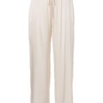 Deze satijnen pyjamabroek in de kleur ivoor heeft een zachte, gladde structuur met een subtiele glans. Het model valt soepel en heeft een elastische tailleband met bijpassend strikkoord voor een comfortabele pasvorm. De broek is gemaakt van polyester satijn, wat zorgt voor een licht en ademend draaggevoel. De lange rechte pijpen creëren een ontspannen silhouet dat fijn aanvoelt op de huid.Highlights