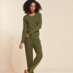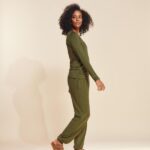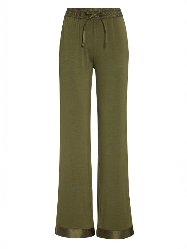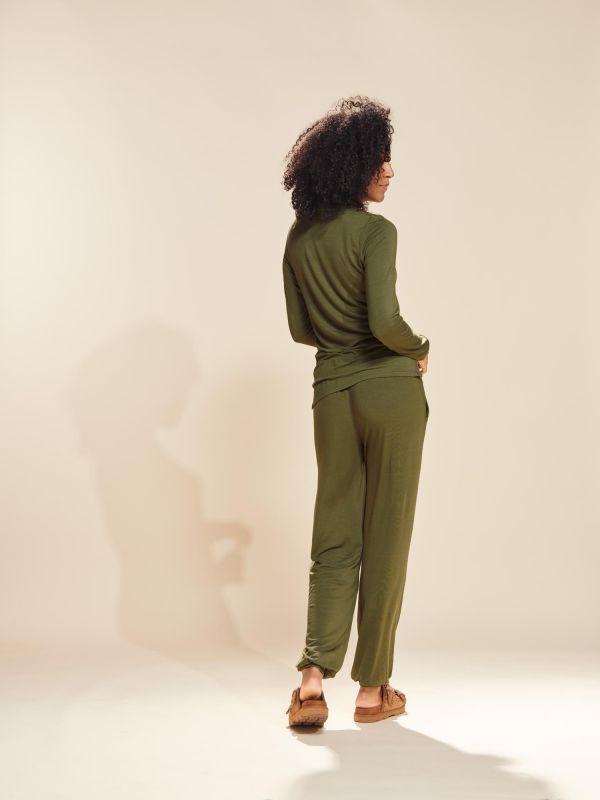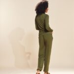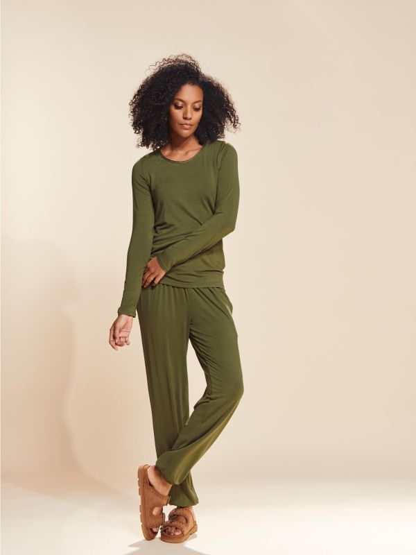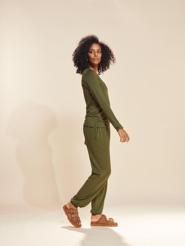 Deze Nora broek van Essenza is in het groen. Maak kennis met de Nora broek, een perfecte mix van comfort en elegantie. Deze broek heeft een middelhoge taille en een elastische tailleband met een aansnoerlint, waardoor hij niet alleen stijlvol maar ook uiterst comfortabel is om te dragen. De rechte, wijde pijpen geven de Nora broek een tijdloze look, terwijl de schuine steekzakken een praktisch en chic detail toevoegen. Deze stof is gemaakt van het natuurlijke materiaal modal, gecombineerd met elastaan. Modal wordt gemaakt van beukenhoutpulp. Haar zachte eigenschap maakt het een perfecte stof voor pyjama’s en homewear. Modal is een heerlijk draagbare, soepele stof die naar het lichaam vormt. Deze Uni valt op door zijn rustgevende eenvoud. Zonder patroon of afleiding draait het volledig om pure kleur en helderheid. Dit ingetogen ontwerp straalt tijdloze elegantie uit en laat zich moeiteloos combineren met meer uitgesproken items. Combineer bijvoorbeeld met de Fedelia of Augustine print. Perfect voor liefhebbers van een minimalistisch design en een rustige uitstraling. Ook in antraciet verkrijgbaar.-