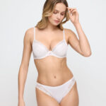 Details: transparant gebloemd kant, speels afgewerkte randen, effen materiaal aan de voorkant en een effen driehoekje aan de achterkant, Marie Jo logo rechts vooraan, strikje aan de achterkant, gevoerd kruis