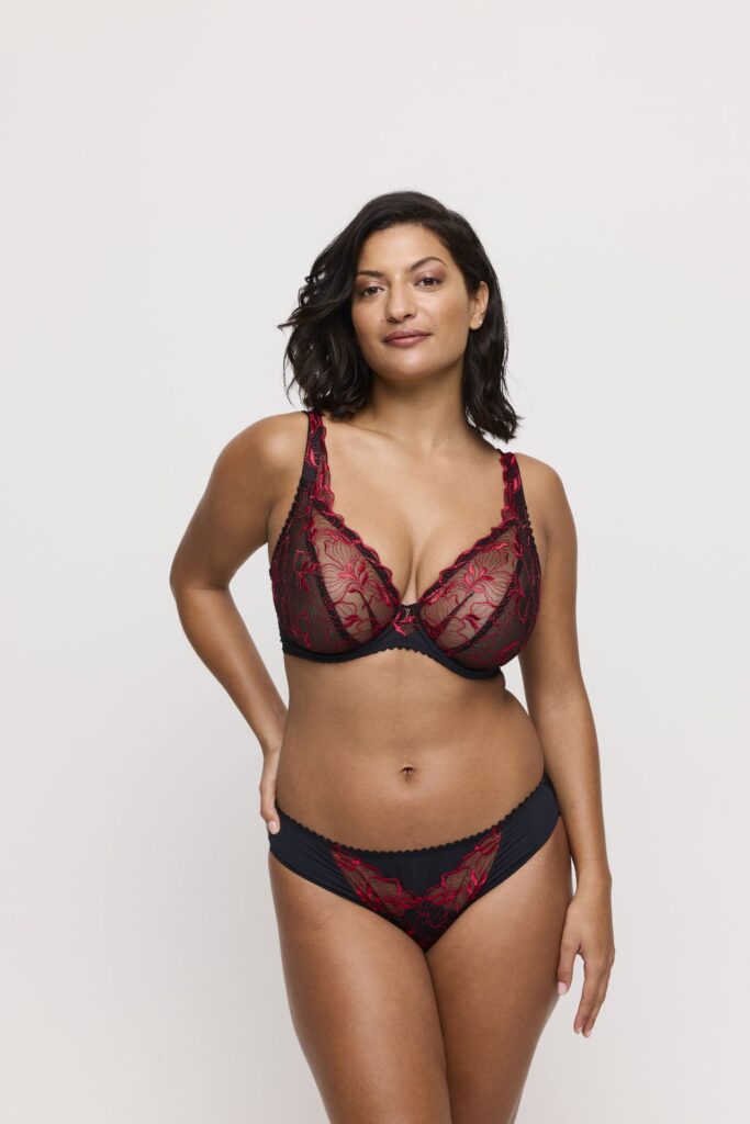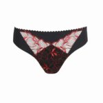 De Prima Donna SPRINGDALE slip rio is uitgevoerd in de stijlvolle kleur zwart en valt op door de gedetailleerde afwerking. Je ziet aan de voorzijde inzetten van transparante tule die zijn verrijkt met een kleurrijk bloemenborduursel in rood en lichte tinten. De stof in het midden en aan de achterzijde is glad en ondoorzichtig voor een rustige uitstraling. Deze rio slip heeft een elegante beenuitsnijding die je benen optisch verlengt en is afgewerkt met een fijn schulprandje langs de taille. Het materiaal voelt zacht aan en biedt een comfortabele pasvorm.