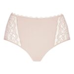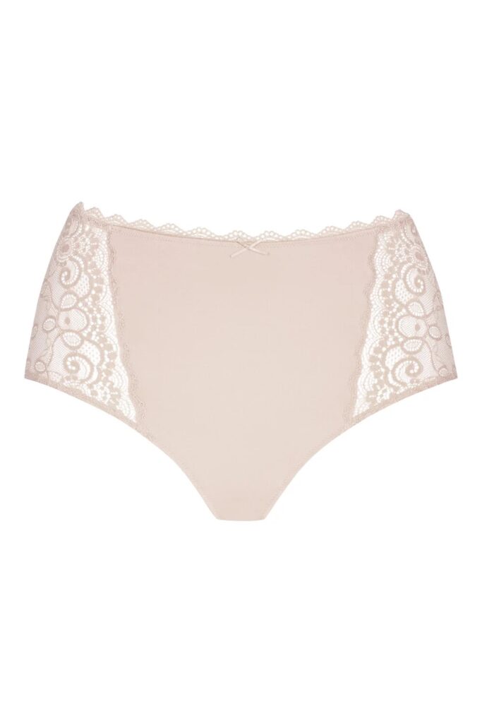 De Mey Amorous taille slip is huidkleur. De slip is effen met op de heupen aan beide kanten transprant gebloemd kant. De boord is speels afgewerkt. Aan de voorkant zit een strikje. Voorzijde van de slip is extra verstevigd, en geeft een licht corrigerend effect. Hoog en omsluit de billen helemaal.-