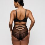 Deze Prima Donna NAICA speciale slip taille in de kleur zwart combineert een comfortabele pasvorm met een verleidelijke uitstraling. Het model valt hoog in de taille en corrigeert de buik licht dankzij de stevige, ondoorzichtige stof aan de voorzijde. De zijkanten en achterkant zijn gemaakt van transparante kant met een grafisch patroon. Een opvallend detail zijn de gekruiste bandjes aan de achterzijde, wat zorgt voor een speels effect. Deze slip taille biedt een mooie bedekking en blijft goed op zijn plek zitten.