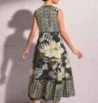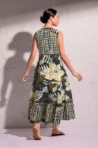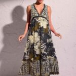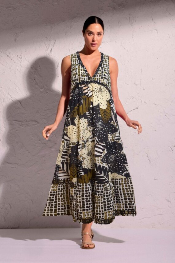 Details: Deze maxi dress van Davidbeach is een mooie geprinte kleurencombi van zwart, zand en groen. Een hele mooie soepel vallende jurk met v-hals waarin alle prachtige details heel mooi uitkomen. Jurk heeft verschillende prints en pailletjes op het bovenstukje. Jurk heeft mooie stroken in en draagt heerlijk luchtig. Combineer mooi met je effen badpak of bikini en je het een super gave set!