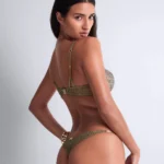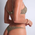 Details: transparant groene broderie voor en achter, gouden bedeltje aan de voorkant. Prachtige smalle glanzende bandjes op de heupen. Gevoerd kruis.