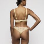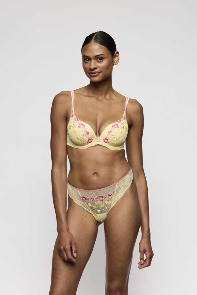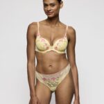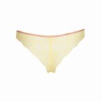 De Marie Jo LIZELOT string string in de kleur geel brengt direct een zomerse sfeer. Deze string is uitgevoerd in transparant tule aan de voorzijde, verrijkt met een gedetailleerd bloemenborduurwerk in roze en blauwe tinten. Een decoratieve rand in een contrasterende kleur siert de tailleband. De achterzijde bestaat uit volledig transparant kant met een subtiel bloemenmotief, wat zorgt voor een lichte en vrouwelijke uitstraling. De hoog uitgesneden benen laten je benen optisch langer lijken. Het materiaal voelt zacht aan op de huid.