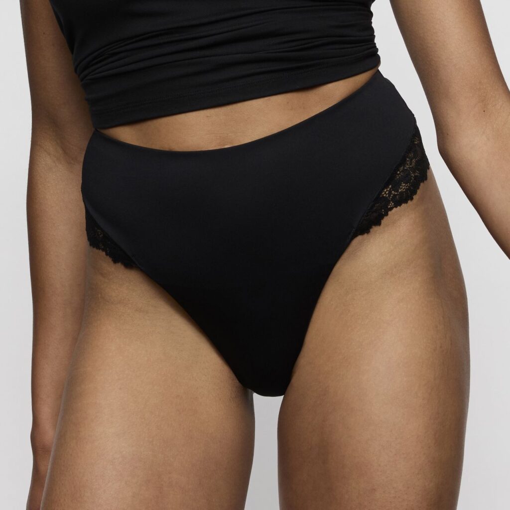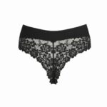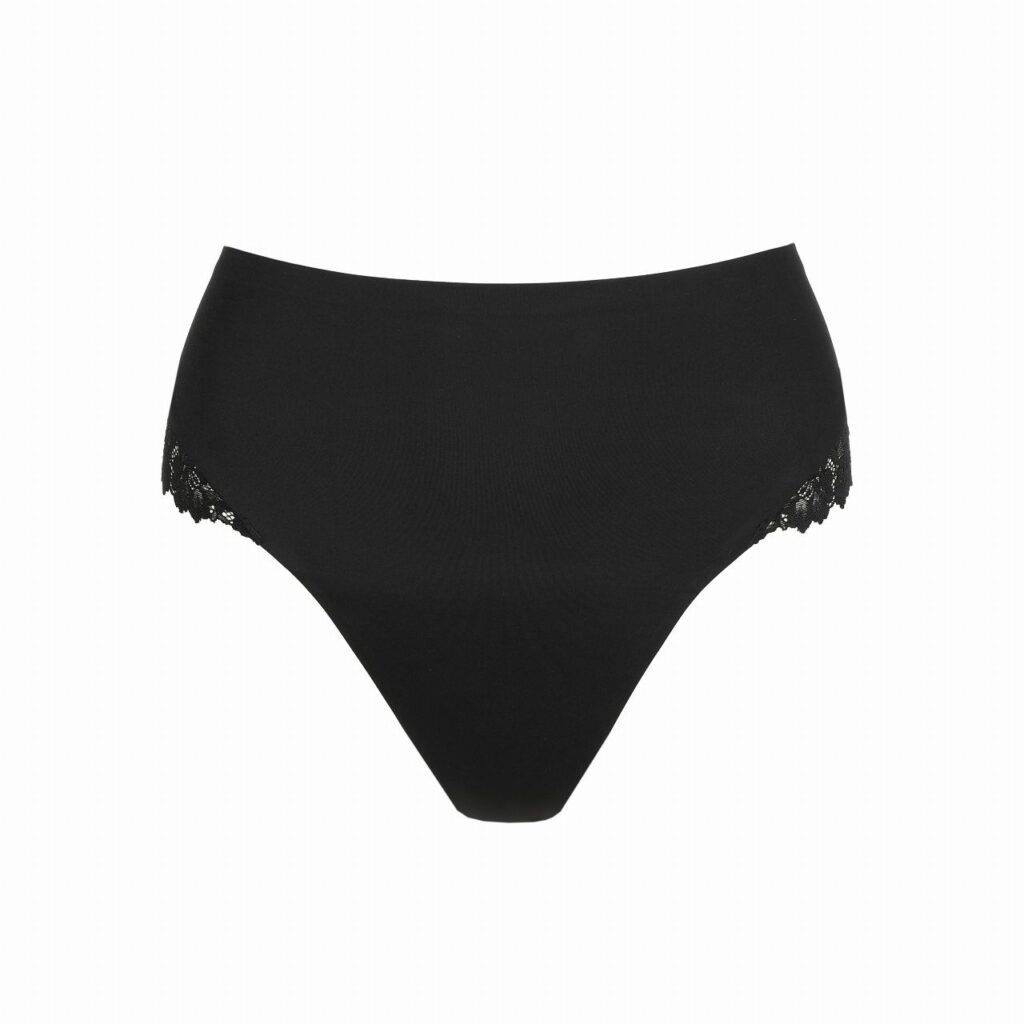 De Marie Jo Soft Studio string in de kleur zwart kenmerkt zich door een combinatie van gladde materialen en verfijnd kant. De voorzijde is uitgevoerd in een egale stof die zacht aanvoelt en een strakke uitstraling geeft. Aan de achterzijde en zijkanten is gekozen voor transparant kant met een gedetailleerd bloemenmotief. Dit model heeft een hoge taille en is hoog uitgesneden bij de benen voor een optisch verlengend effect. De zwarte slip sluit mooi aan op het lichaam en biedt een comfortabele pasvorm. Deze lingerie combineert functionele eigenschappen met een elegante afwerking.