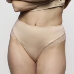 Deze Marie Jo SOFT STUDIO string in de kleur Huid combineert een strakke look met vrouwelijk detail. De voorzijde is uitgevoerd in een gladde stof die zorgt voor een gestroomlijnd silhouet. Aan de achterzijde en rondom de beenuitsnijdingen zie je verfijnd kant met een bloemenmotief. Dit model valt hoog in de taille en sluit mooi aan op de heupen. Dankzij de vlakke afwerking is deze string nagenoeg onzichtbaar onder kleding. Het katoenen kruis zorgt voor een fris gevoel gedurende de dag.
