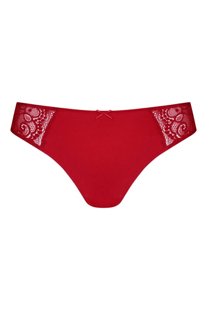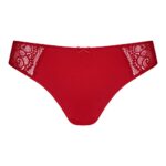 De Mey Allegra string is rood. De string is aan de voorzijde effen met vanaf de heupen naar de billen gebloemd transparant materiaal. De boord is speels afgewerkt. Aan de voorkant zit een strikje.Extra informatie