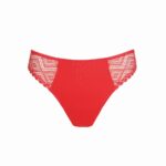 De Twist PD GRACE BAY string in de kleur oranje combineert een moderne uitstraling met een fijne pasvorm. Dit model is vervaardigd uit een gladde stof en verrijkt met geometrisch kant aan de zijkanten voor een speels effect. De string valt laag op de heupen en laat de billen grotendeels vrij. Dankzij de vlakke afwerking is dit item nauwelijks zichtbaar onder strakke kleding. Het materiaal voelt zacht aan op de huid en biedt voldoende elasticiteit. Deze string is een ideale basis voor een zomerse set.