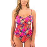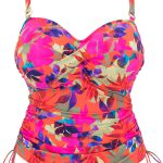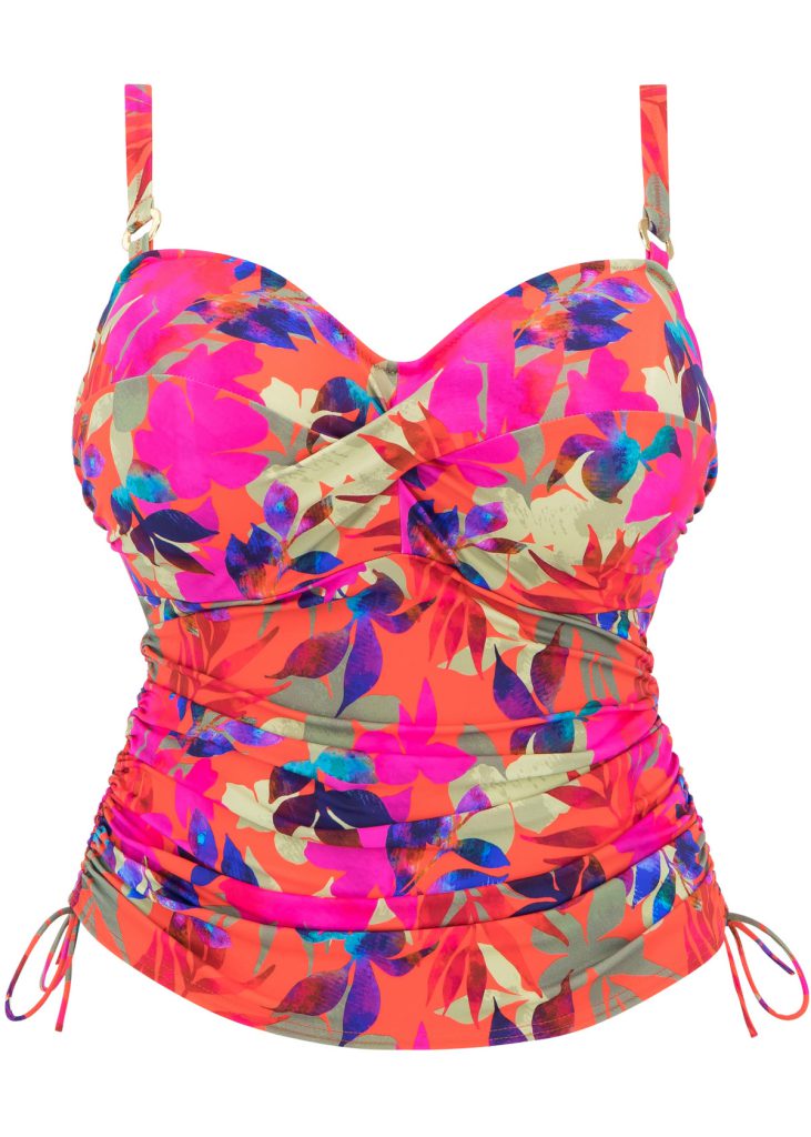 Details: De Playa del carmen tankini van Fantasie Swim is uitgevoerd in een mooie tropische print! Deze tankini heeft een geweldige kleurenmix, waar je gelijk vrolijk van word! De top heeft een mooie pasvorm door het twistdetail tussen de cups en geeft de borsten goede ondersteuning. Daarnaast is de top ook erg comfortabel door de fijne stretchstof die gebruikt is. Aan de zijkanten zitten aantrekkoordjes waarmee je de top hoger op je heupen kan laten vallen of juist wat rechter als je minder plooitjes wilt. Combineer met één van de mooie bijpassende broekjes of strandrok voor een complete look.