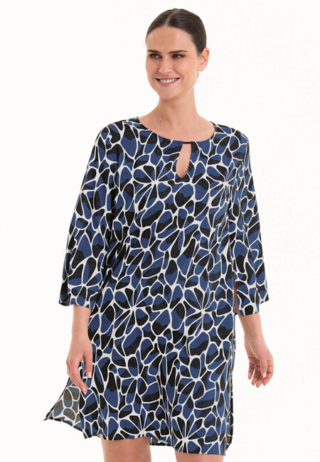 Details: Een heerlijke luchtige tuniek is deze Salla van Anita. Tuniek heeft een ronde hals en middenvoor een kleine opening. Split aan de onderzijde van de mouwen en splitjes aan de onderkant. De driekwart mouwen en splitten bij de armen en benen zorgen voor aangename bewegingsvrijheid. Combineer met de leuke bikini of het badpak uit deze serie en je hebt super leuk beachlook! Twijfel je over de maat, kies een maatje kleiner. Valt wat ruimer, maar dit is ook het model, zit geen stretch in.