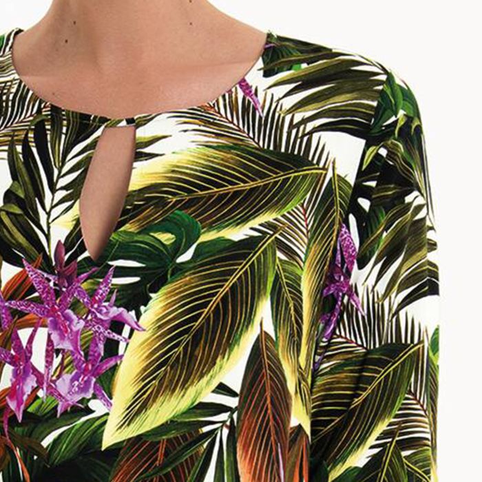 Details: Deze heerlijke luchtige tuniek Salla van Anita heeft een prachtige kleurenmix van roze en groen tinten. Tuniek heeft een ronde hals en middenvoor een kleine opening. Split aan de onderzijde van de mouwen en splitjes aan de onderkant. De driekwart mouwen en splitten bij de armen en benen zorgen voor aangename bewegingsvrijheid. Combineer met de leuke bikini uit deze serie en je hebt super leuk beachlook!