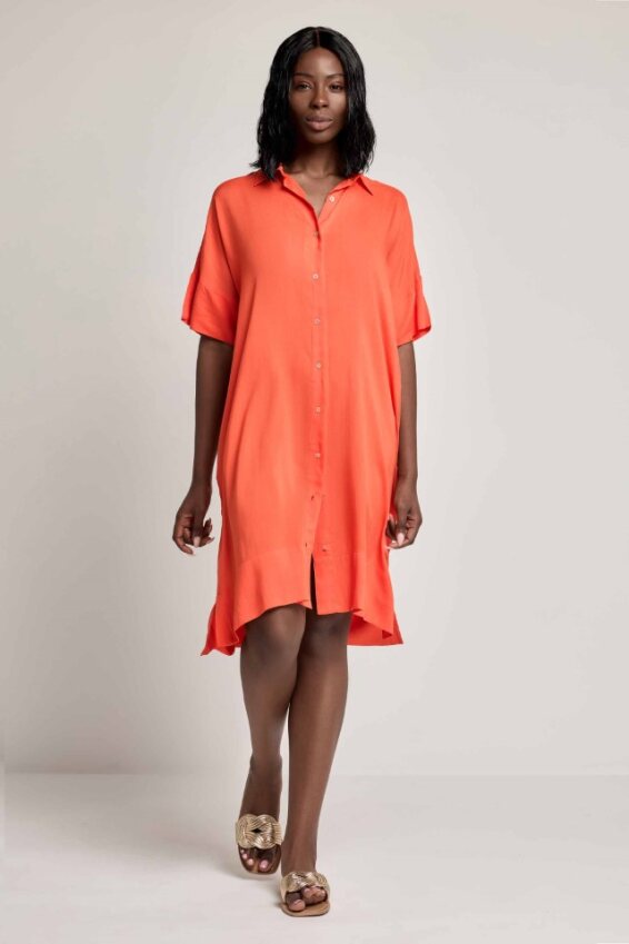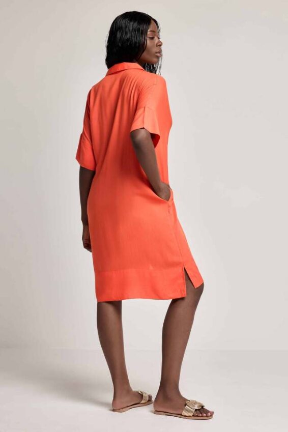 Deze oranje blousejurk van Davidbeach valt losjes op het lichaam en heeft een klassieke hemdkraag met knoopsluiting aan de voorkant. De korte mouwen en de lichte, soepel vallende stof maken dit een fijn zomerstuk voor warme dagen. De tuniek valt tot kniehoogte en heeft aan beide zijkanten een split, wat de bewegingsvrijheid vergroot. Aan de achterkant zijn zijzakken zichtbaar.