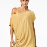 De Goldbergh LEONE dress in de kleur goud is een soepel vallende jurk met een asymmetrische one-shoulder hals. Het jurkje heeft korte vleermuismouwen en valt wijd en luchtig over het lichaam. Een opvallend detail aan de zijkant is de gerimpelde ruching met een strikkoord, waarmee je de lengte en pasvorm zelf aanpast. De stof heeft een gladde, zachte structuur en valt soepel door het lichaam.