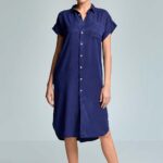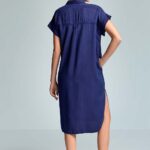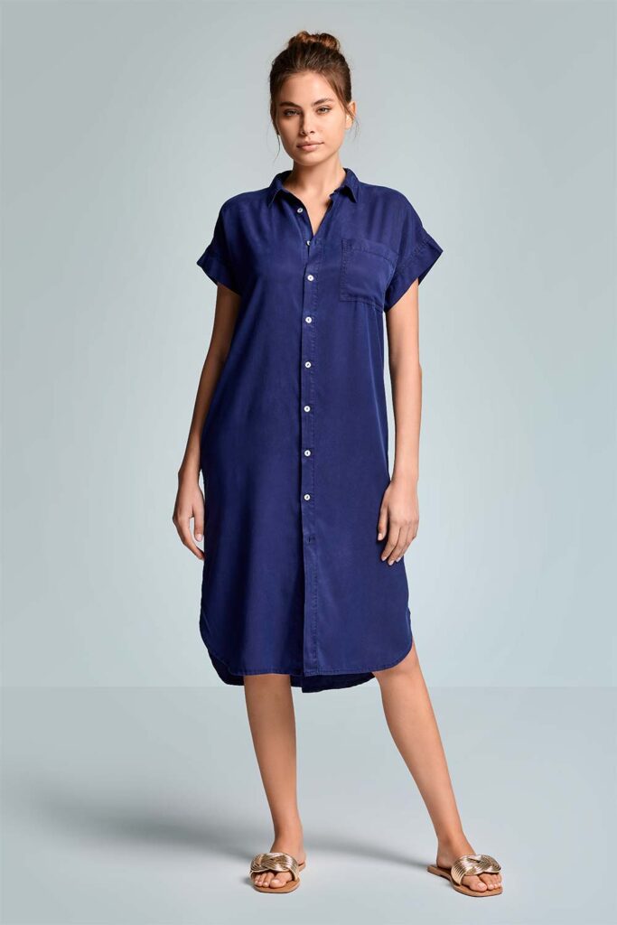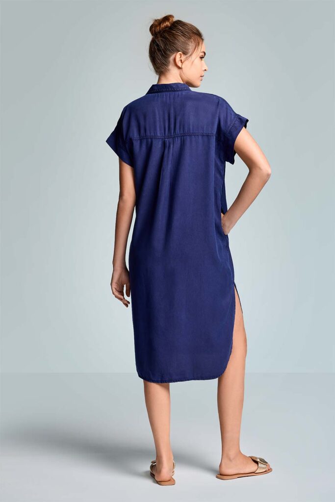Deze marine blousejurk van Iconique valt los en soepel op het lichaam en heeft een klassieke hemdkraag met korte omgeslagen mouwen. De effen marine kleur geeft de jurk een strakke, verzorgde uitstraling. Op de voorzijde zit een borstzakje en de jurk sluit af met witte knoopjes van boven naar onder. Aan de zijkanten zijn splitjes zichtbaar en op de achterzijde is een decoratieve naad over de schouderlijn te zien. Het soepel vallende materiaal voelt licht aan.