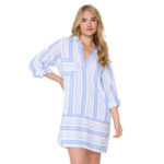 Dit gestreepte slaapshirt combineert bleu en witte tinten in een verticaal streepdessin. Het kledingstuk heeft een hemdkraag en een knoopsluiting aan de voorzijde, zodat je zelf bepaalt hoe je het draagt. De lange mouwen kun je opstropen voor een casual uitstraling. Aan de linkerkant vind je een borstzakje verwerkt. Het nachthemd valt soepel en heeft een tunieklengte die tot boven de knie reikt. Het lichte materiaal voelt zacht aan en geeft je bewegingsvrijheid. De onderzijde is voorzien van een horizontale streepstructuur die het design afmaakt.