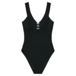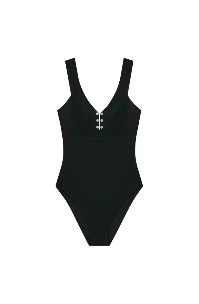 Dit modische badpak ANTON 61 van het merk Pain de Sucre combineert een tijdloze uitstraling met modern comfort. Het ontwerp in de kleur zwart valt op door de diepe V halslijn en de decoratieve zilverkleurige knoopjes aan de voorzijde. Dankzij de brede schouderbanden en de naad onder de borst biedt dit item een prettige pasvorm. Dit badpak voorgevormd sluit mooi aan op je lichaam en zorgt voor een elegante look. Met deze stijlvolle zwarte badmode kies jij voor kwaliteit en een verfijnde uitstraling aan het zwembad of op het strand.